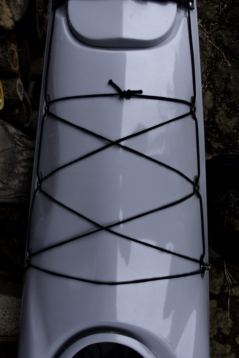 伸びきった古いバンジーコードを張り替える。案外多くの場所にバンジーコードが使われている。バウのグリップを固定するコード。バウに予備パドルを取り付けるためのコード。写真はデッキに小物を固定するためのコード。コクピット後ろに小物(僕は熱いコーヒーの入ったサーモスの瓶)を固定するためのコード。スターンに予備パドルを取り付けるためのコード。スターンのグリップコード。輸送時ラダーを固定するためのコード。今回新たにラダーのフリップアップワイヤーを固定するためのコードを設けた。これらに5mmのバンジーコードを8メートル使った。