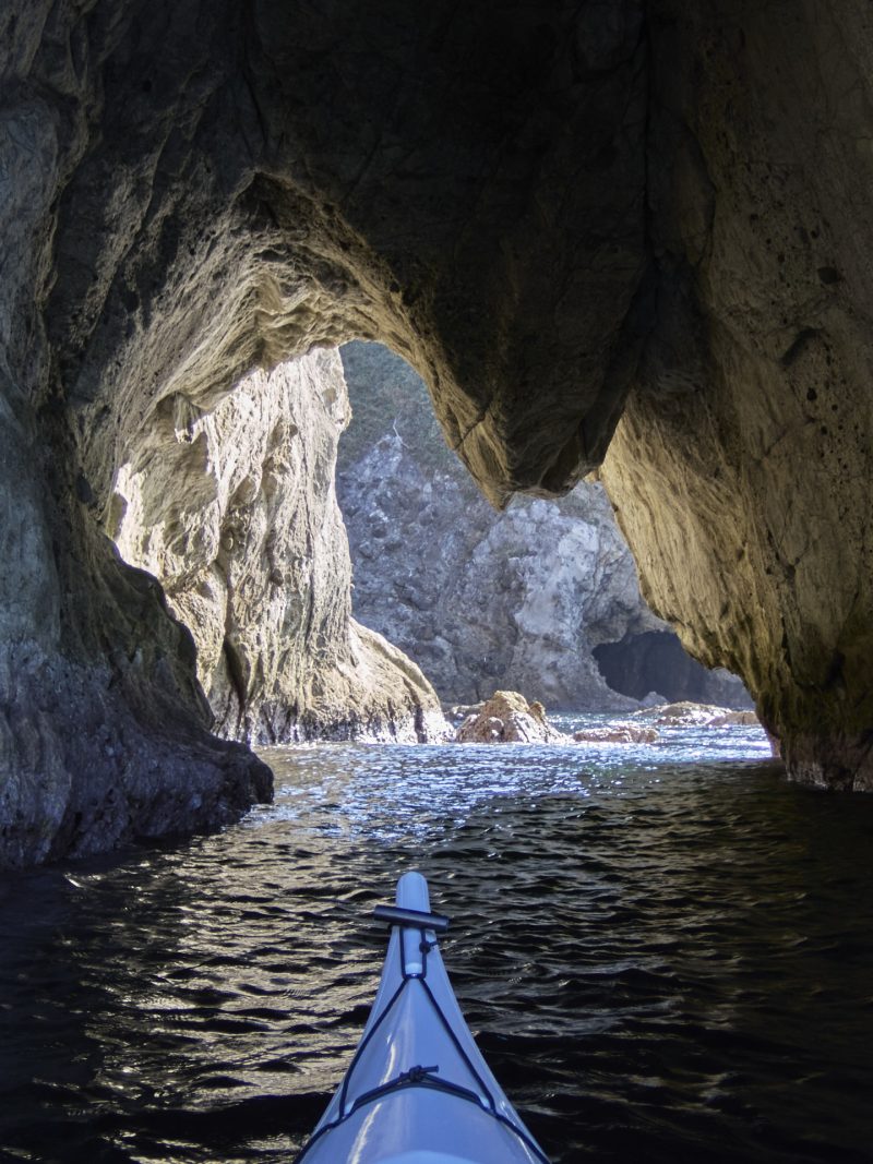 「タイムトンネル」というアメリカのTVドラマがあった。詳細は憶えていないがトンネル状のタイムマシンをくぐり抜けると過去や未来にシフトしてしまうといった話だった。洞窟をみつけるときの現実の景色は洞窟に入ったとたん、思考は停止する。閉ざされた重くて堅い空間におかれて、聴こえるのは入口か出口のくぐもった反響音。パドルを立てためったに使わないドローストロークでいざるように這い出る。そこはまた別の景色に出くわす。洞窟を通過するとドラマ「タイムトンネル」を思い出す。もしかしたら本当に時間が違っているのかもしれない。