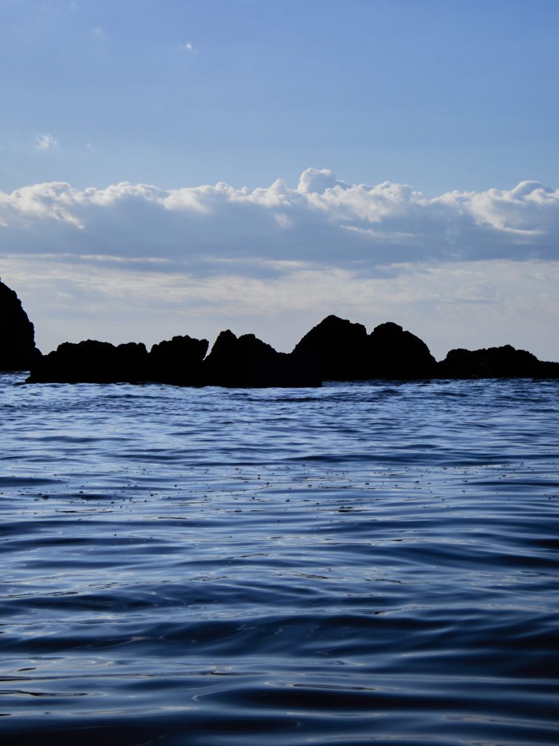 岩石のから山なみへと南伊豆に入ると地形が変わる。ここで海亀と遭遇。この3月にもほぼ同場所で海亀と出会った。かなり接近するがカヤックを見るや慌てて潜り去る。亀と同様に私も驚く。カメラを抜く間もない。この体験は記憶にとどめるのが良い。キビナゴの群れとは幾度も遭う。うるさいエンジンのないカヤックの良さだと思う。