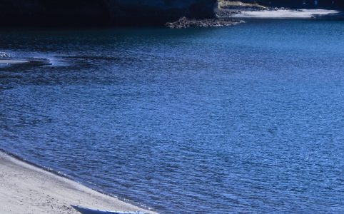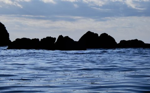 夜明けとともに出艇。早朝に漕ぎだす理由は、短い昼間を有効に使うためとか朝凪の内に離岸とかあるかど言い訳にすぎない。日の出前後に一瞬出現する「蒼の時」に身を投じたいからだ。限りなく静かな海にパドルを入れる。空と水面、海面下...